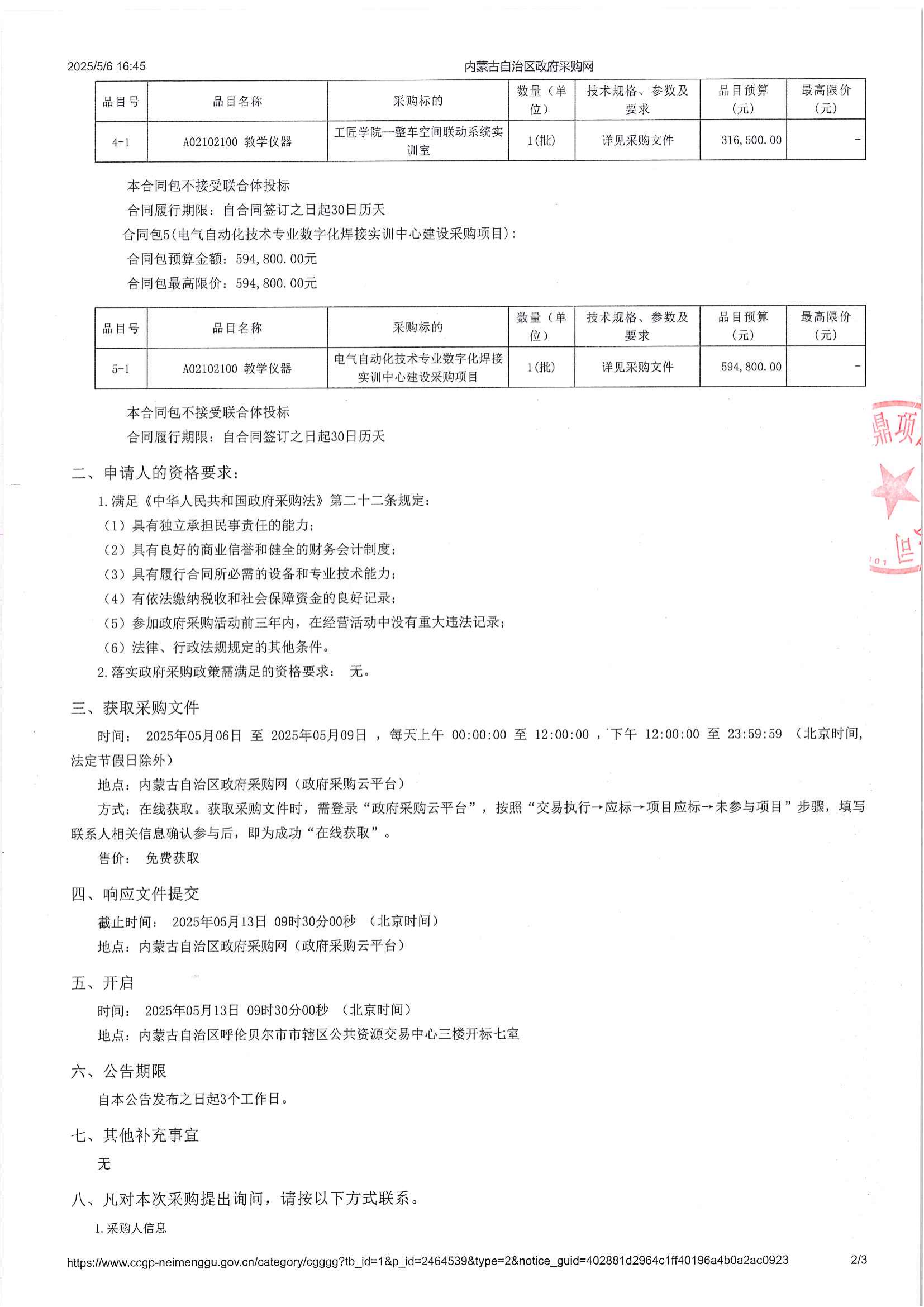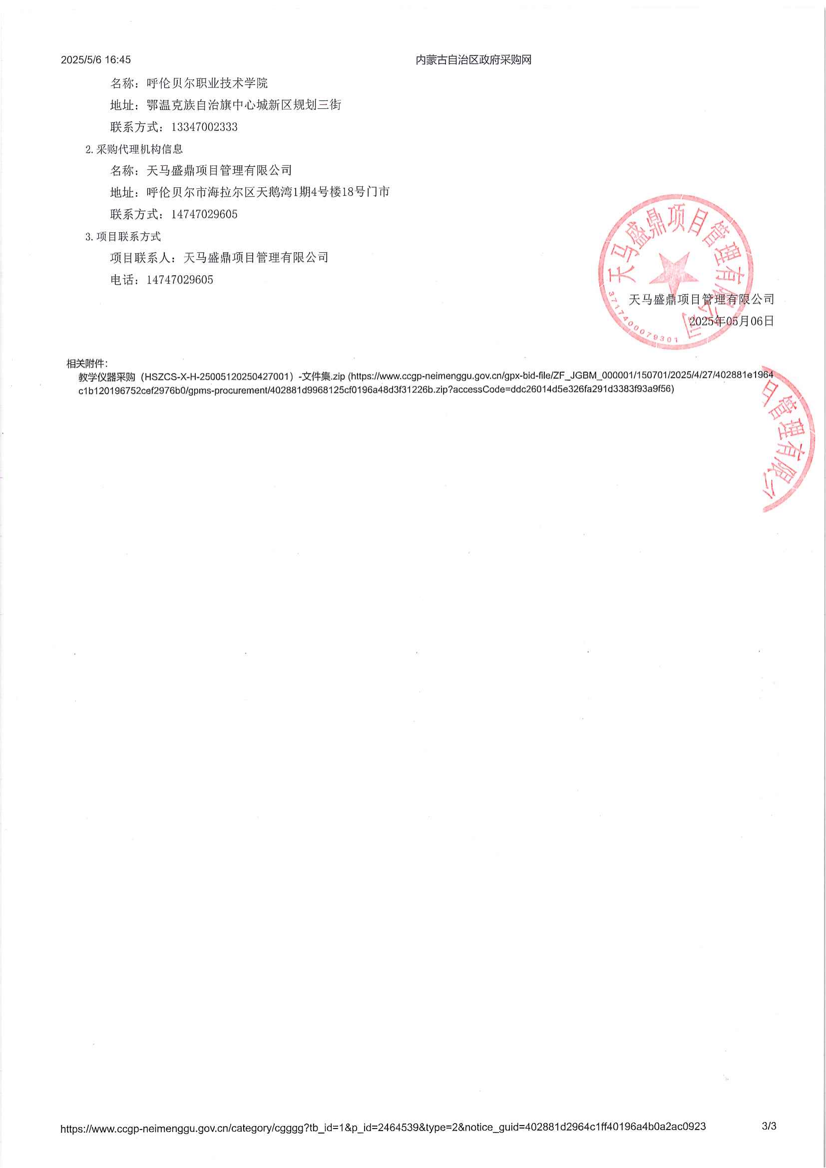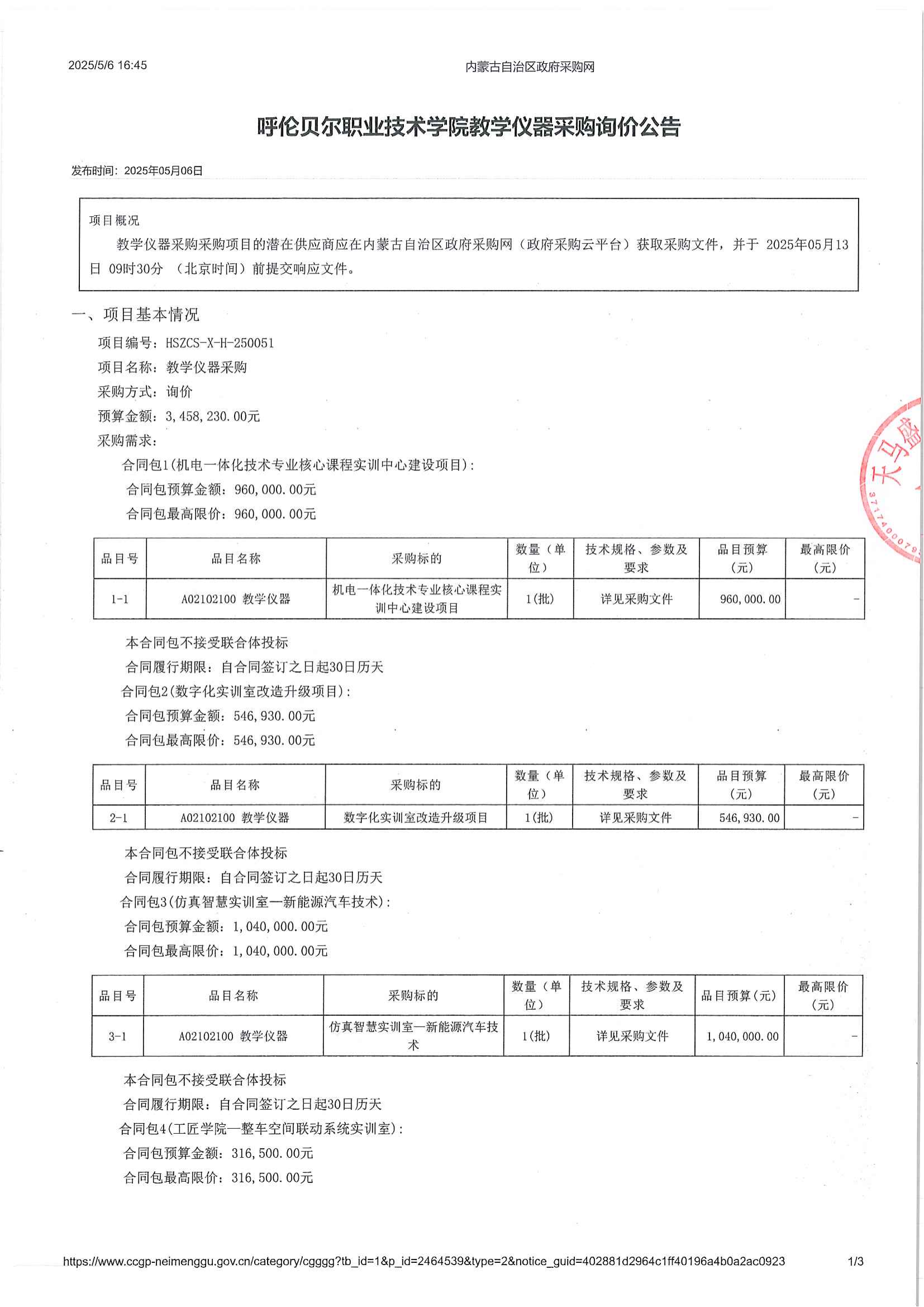 呼伦贝尔职业技术学院教学仪器采购询价公告