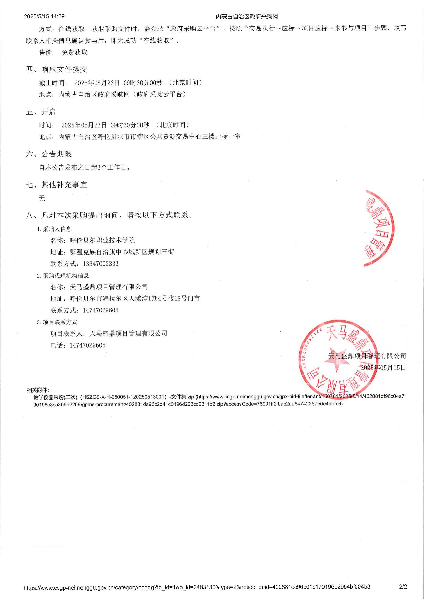 呼伦贝尔职业技术学院教学仪器采购(二次)询价公告